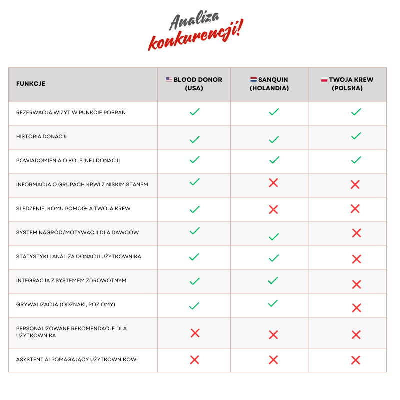 Przeprowadziłem analizę konkurencyjnych aplikacji do krwiodawstwa z różnych krajów, aby zidentyfikować ich kluczowe funkcje oraz potencjalne luki, które możemy wykorzystać do wyróżnienia naszego produktu.